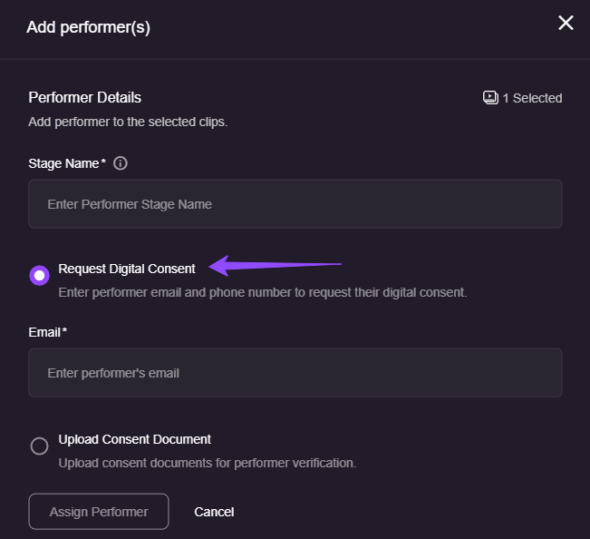 Wenn du deine Clips hochlädst und hinzufügst oder auf der Registerkarte „Aktion erforderlich“ die Massenaktion „Darsteller hinzufügen“ auswählst, kannst du entweder Darsteller-Dokumente hochladen oder die digitale Einwilligung direkt von den Darstellern anfordern. Befolge dazu einfach die folgenden Schritte:
