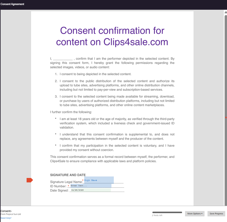 Wenn der Darsteller Ihre E-Mail zur Bestätigung der digitalen Einwilligung erhält, muss er zunächst die Altersverifizierung durchführen, um zu bestätigen, dass er 18 Jahre oder älter ist. Erst danach gelangt er auf die Seite mit einer Liste seiner Clips, für die eine digitale Einwilligung erforderlich ist.