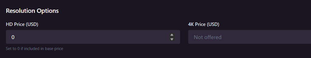 Resolution Options - If you want, you can offer 4K at an elevated price. If you don't want to offer it, leave the field blank.