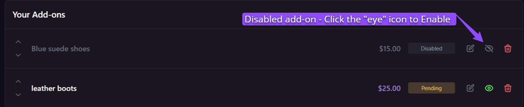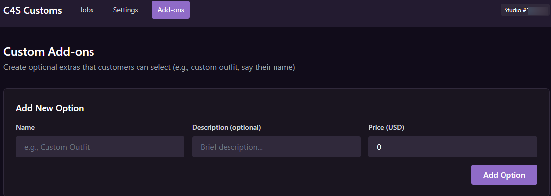 On the Add-ons page, you can create and manage optional extras that customers can select (e.g., custom outfit, say their name, etc.). Add the add-on name, description (optional) and price (USD), then click "add option" button.