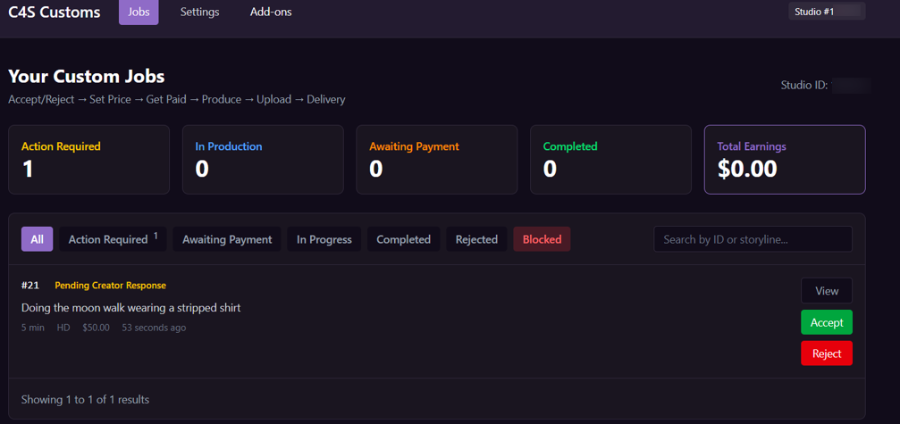 - Once it’s approved by Moderation, it appears in the JOB section of the Customs Admin under Action Required tab - https://customs.clips4sale.com/admin/customs