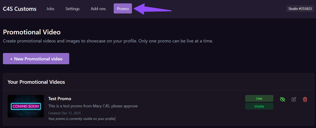 Here you can create promotional videos and images to showcase on your Custom form. You can add multiple promo videos, but only one can be live at a time.