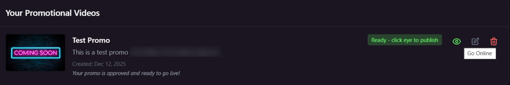 Promo video needs a title, performer profile(s), description, cover image (thumbnail) and can be set to be live from/to dates.